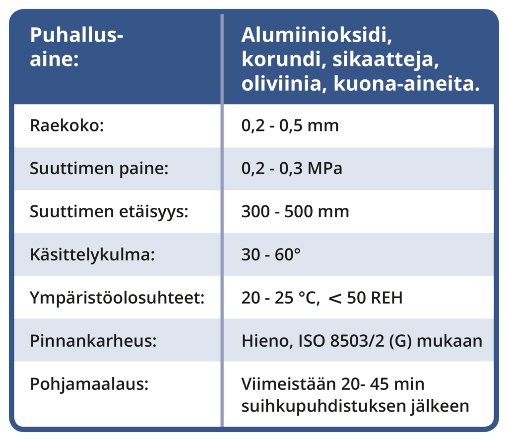Jotta jauhemaalaus saadaan onnistumaan ja kestämään yhtä hyvin kuin märkämaalaus, on kyseiset tuotteet myös pyyhkäisysuihkupuhdistettava, jotta kaikki epäpuhtaudet poistuvat ja saadaan riittävä pintaprofiili tartunnan varmistamiseksi.