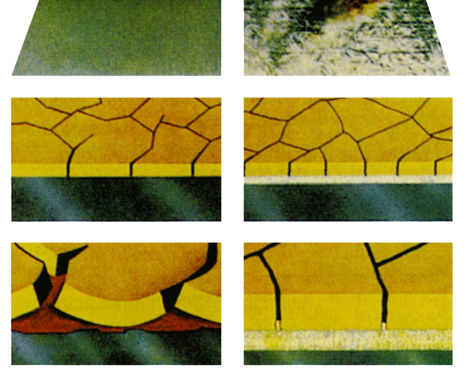 Vasemmalla: Kaaviokuva osoittaa, kuinka värikerroksen mikrohalkeamat aiheuttavat teräkseen pohjaruostetta ja hilseilyä.