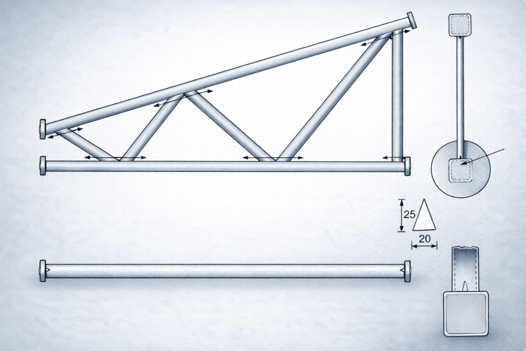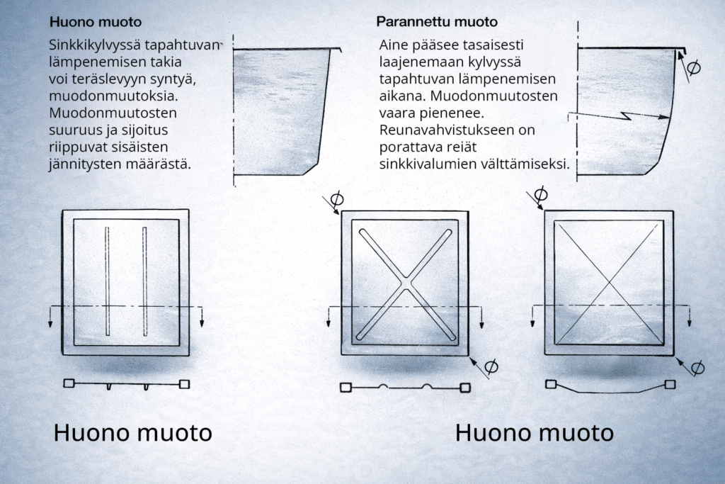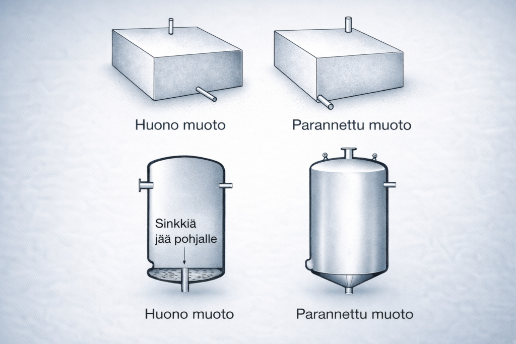 Kuva 4. Sisään työntyvät putkiosat säiliössä estävät säiliön tyhjenemisen. Sijoita putkiosat lähelle kulmia lävistäjän suuntaisesti. Sinkin valuminen helpottuu myös, jos putkiosat eivät ole kovin pieniä – Ø 50 mm jokaista 0,5 m3 kohti on hyvä sääntö. Suuremmissa säiliössä pitää olla nostokorvakkeet käsittelyn helpottamiseksi.