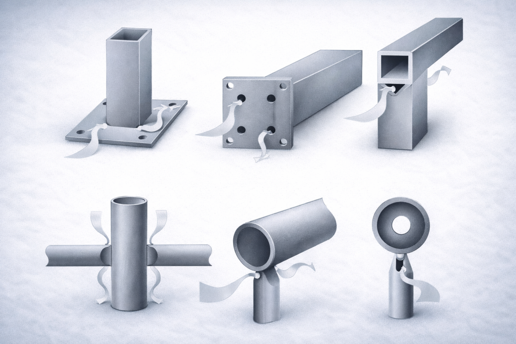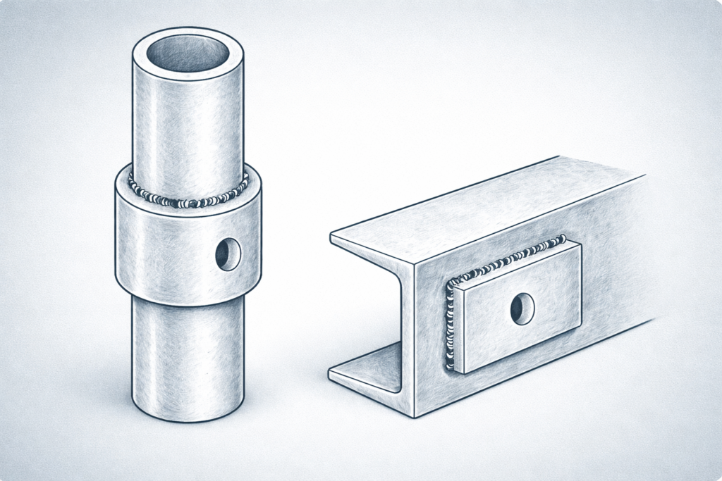 Kuva 7. Esimerkkejä päällehitsatuista vahvikkeista, jotka pitää varustaa tuuletusreiällä, jos peitetty ala on suurempi kuin n. 100 cm2 .